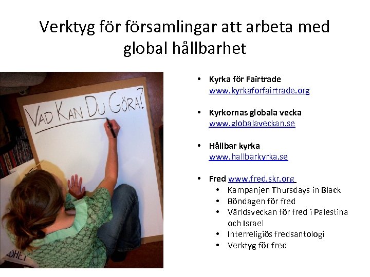 Verktyg församlingar att arbeta med global hållbarhet • Kyrka för Fairtrade www. kyrkaforfairtrade. org • Kyrkornas globala vecka www. globalaveckan. se • Hållbar kyrka www. hallbarkyrka. se • Fred www. fred. skr. org • Kampanjen Thursdays in Black • Böndagen för fred • Världsveckan för fred i Palestina och Israel • Interreligiös fredsantologi • Verktyg för fred