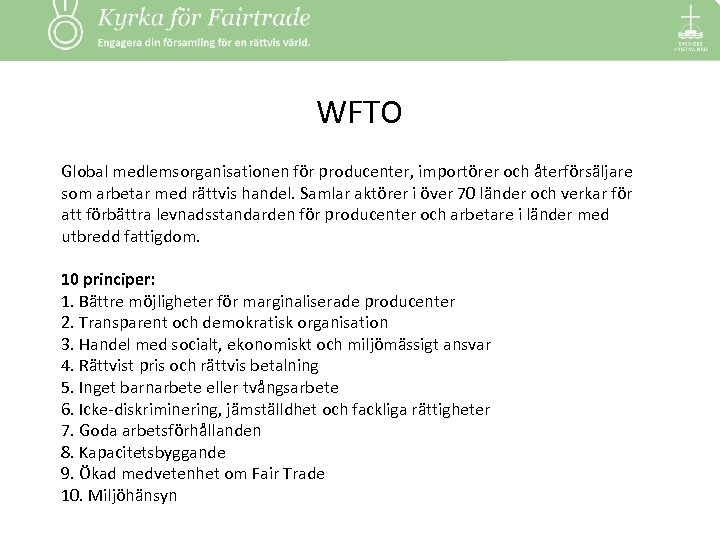 WFTO Global medlemsorganisationen för producenter, importörer och återförsäljare som arbetar med rättvis handel. Samlar aktörer i över 70 länder och verkar för att förbättra levnadsstandarden för producenter och arbetare i länder med utbredd fattigdom. 10 principer: 1. Bättre möjligheter för marginaliserade producenter 2. Transparent och demokratisk organisation 3. Handel med socialt, ekonomiskt och miljömässigt ansvar 4. Rättvist pris och rättvis betalning 5. Inget barnarbete eller tvångsarbete 6. Icke-diskriminering, jämställdhet och fackliga rättigheter 7. Goda arbetsförhållanden 8. Kapacitetsbyggande 9. Ökad medvetenhet om Fair Trade 10. Miljöhänsyn