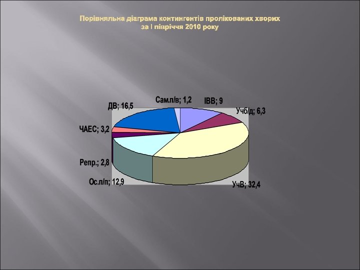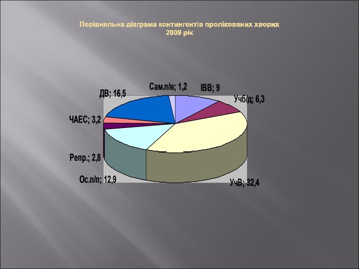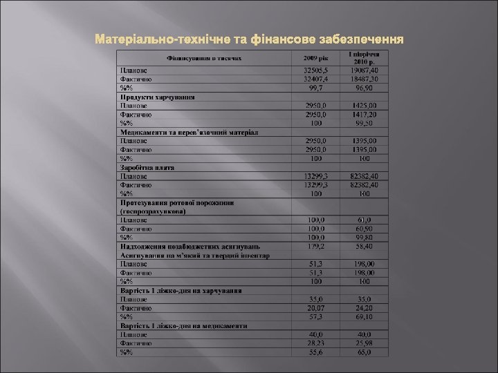 2009 рік 9 міс. 2010 року Поступило хворих 15416 11828 Робота ліжка 353, 0 263, 2 Виписано хворих 15284 11660 Середній ліжкодень 18, 6 18, 2 % виконання плану ліжкоднів 101, 8 101, 5 Померло хворих 87 70 Обіг ліжка 18, 9 14, 5 Летальність 0, 57% 0, 59%