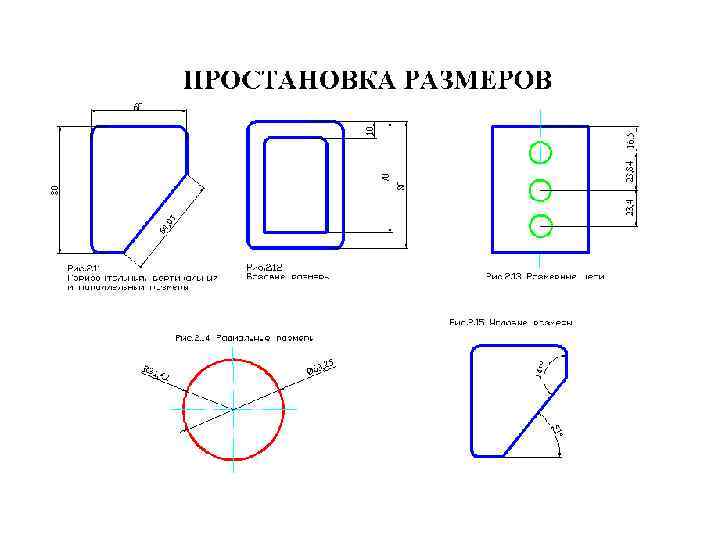 Нанесение размеров. Auto. CAD позволяет наносить размеры трех типов: линейные, угловые и радиальные. В Auto. CAD 2006 появилась также возможность нанесения размера длины дуги окружности. В зависимости от типа объекта и ориентации начальных выносных линий размеры могут быть: горизонтальными, вертикальными, параллельными, повернутыми, ординатными. Размеры также могут проставляться от базовой линии или располагаться цепочкой на одной линии. В большинстве случаев под размером понимают совокупность размерных линий, выносной линии, текста размера (как правило, числового значения), и стрелок или засечек.