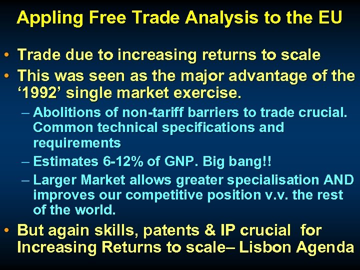 Appling Free Trade Analysis to the EU • Trade due to increasing returns to scale • This was seen as the major advantage of the ‘ 1992’ single market exercise. – Abolitions of non-tariff barriers to trade crucial. Common technical specifications and requirements – Estimates 6 -12% of GNP. Big bang!! – Larger Market allows greater specialisation AND improves our competitive position v. v. the rest of the world. • But again skills, patents & IP crucial for Increasing Returns to scale– Lisbon Agenda