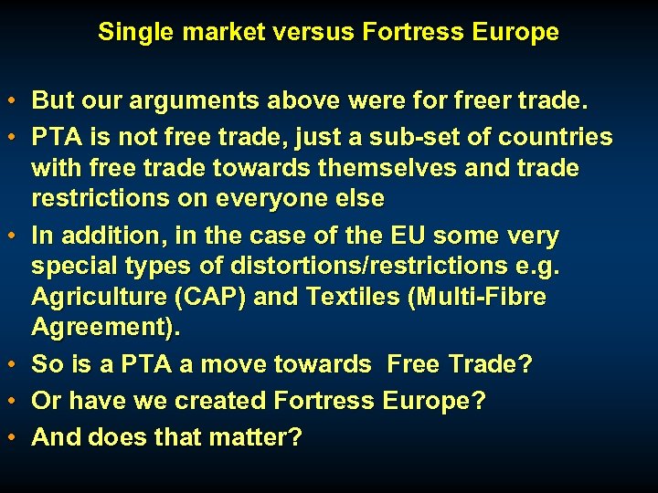 Single market versus Fortress Europe • But our arguments above were for freer trade. • PTA is not free trade, just a sub-set of countries with free trade towards themselves and trade restrictions on everyone else • In addition, in the case of the EU some very special types of distortions/restrictions e. g. Agriculture (CAP) and Textiles (Multi-Fibre Agreement). • So is a PTA a move towards Free Trade? • Or have we created Fortress Europe? • And does that matter?
