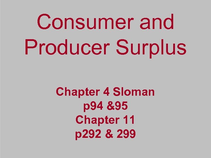 Consumer and Producer Surplus Chapter 4 Sloman p 94 &95 Chapter 11 p 292 & 299
