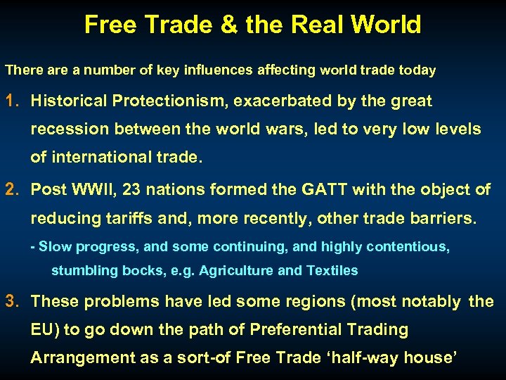 Free Trade & the Real World There a number of key influences affecting world trade today 1. Historical Protectionism, exacerbated by the great recession between the world wars, led to very low levels of international trade. 2. Post WWII, 23 nations formed the GATT with the object of reducing tariffs and, more recently, other trade barriers. - Slow progress, and some continuing, and highly contentious, stumbling bocks, e. g. Agriculture and Textiles 3. These problems have led some regions (most notably the EU) to go down the path of Preferential Trading Arrangement as a sort-of Free Trade ‘half-way house’