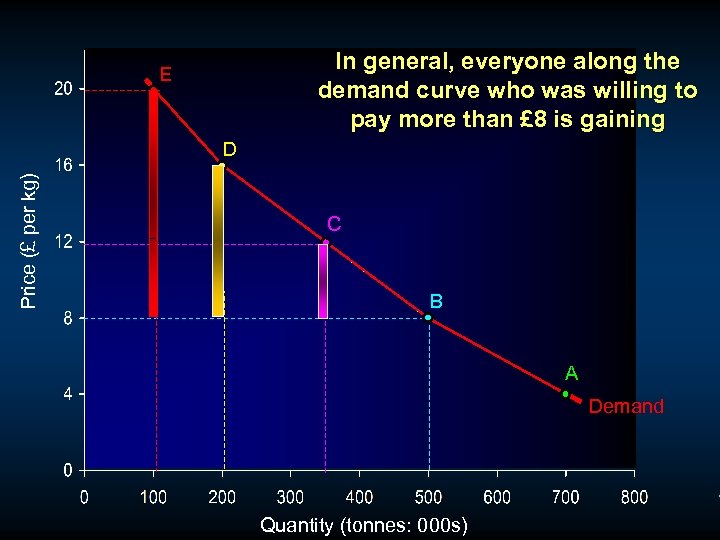 In general, everyone along the demand curve who was willing to pay more than £ 8 is gaining E Price (£ per kg) D C B A Demand Quantity (tonnes: 000 s)