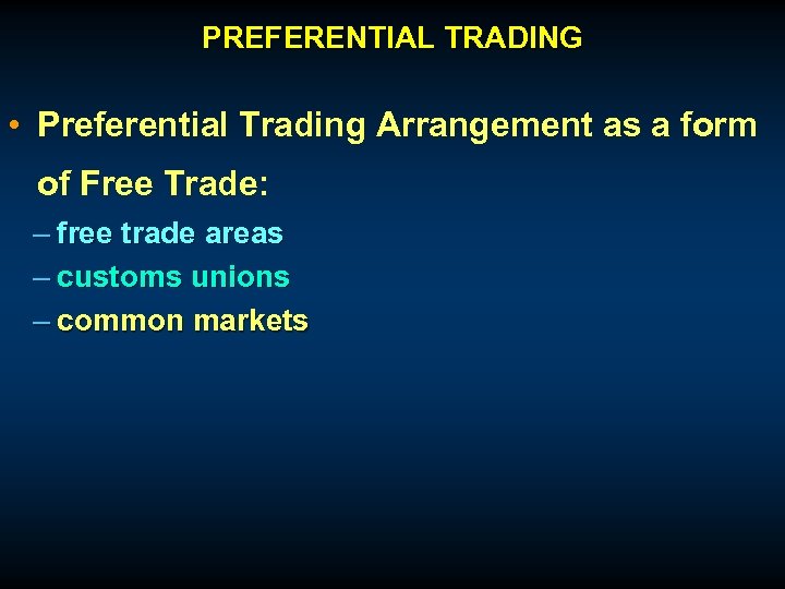 PREFERENTIAL TRADING • Preferential Trading Arrangement as a form of Free Trade: – free trade areas – customs unions – common markets