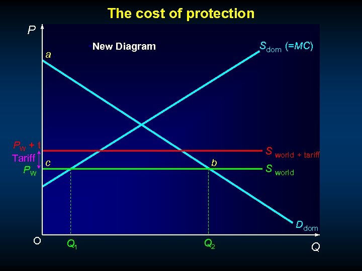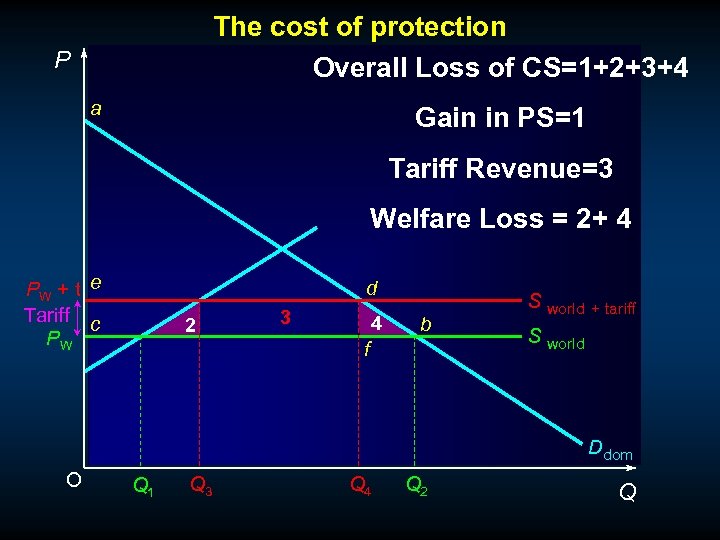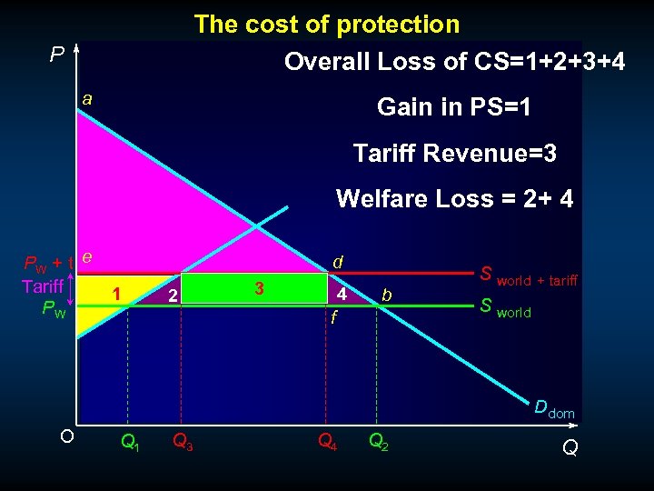 The cost of protection P Sdom (=MC) a PW + t Tariff c PW b S world + tariff S world Ddom O Q 1 Q 3 Q 4 Q 2 Q