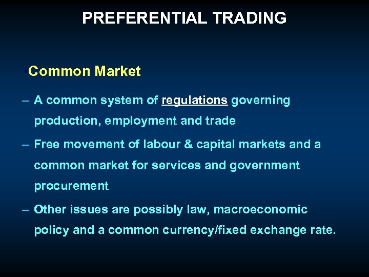 PREFERENTIAL TRADING • Common Market – A common system of regulations governing production, employment and trade – Free movement of labour & capital markets and a common market for services and government procurement – Other issues are possibly law, macroeconomic policy and a common currency/fixed exchange rate.