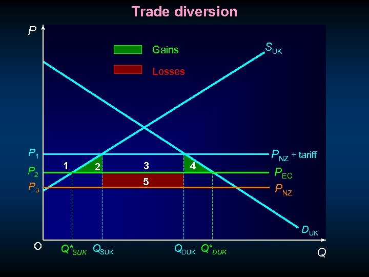 Trade diversion P SUK Gains Losses P 1 P 2 1 2 3 4 5 P 3 PNZ + tariff PEC PNZ DUK O Q*SUK QDUK Q*DUK Q