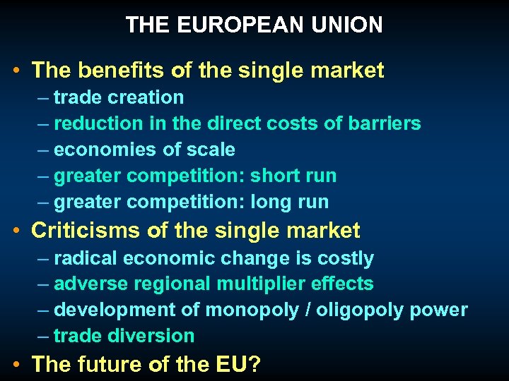 THE EUROPEAN UNION • The benefits of the single market – trade creation – reduction in the direct costs of barriers – economies of scale – greater competition: short run – greater competition: long run • Criticisms of the single market – radical economic change is costly – adverse regional multiplier effects – development of monopoly / oligopoly power – trade diversion • The future of the EU?
