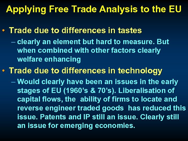 Applying Free Trade Analysis to the EU • Trade due to differences in tastes – clearly an element but hard to measure. But when combined with other factors clearly welfare enhancing • Trade due to differences in technology – Would clearly have been an issues in the early stages of EU (1960’s & 70’s). Liberalisation of capital flows, the ability of firms to locate and reverse engineer traded goods has reduced this issue. Patents and IP still an issue. Clearly still an issue for emerging economies.