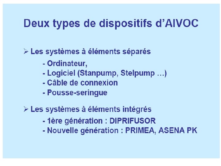 Les premiers pas 2000 -2006 n A Saint Brieuc n Le DIPRIFUSOR TCI est utilisé régulièrement : n n n en ORL en endoscopies digestives… au bloc et en dehors du bloc En Europe n L’AIVOC reste cantonné n n À des secteurs spécialisés et/ou À des équipes universitaires dans le cadre de la recherche n Utilisant des systèmes à éléments séparés n Des logiciels indépendants Ne disposant pas du marquage CE indispensable à leur diffusion