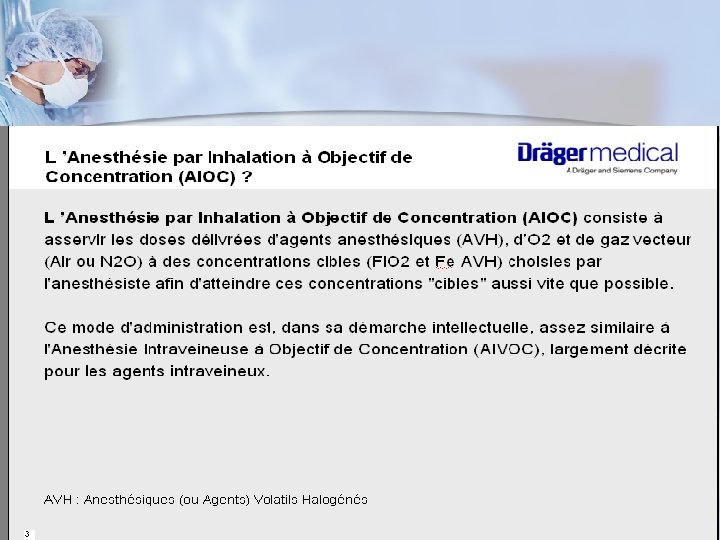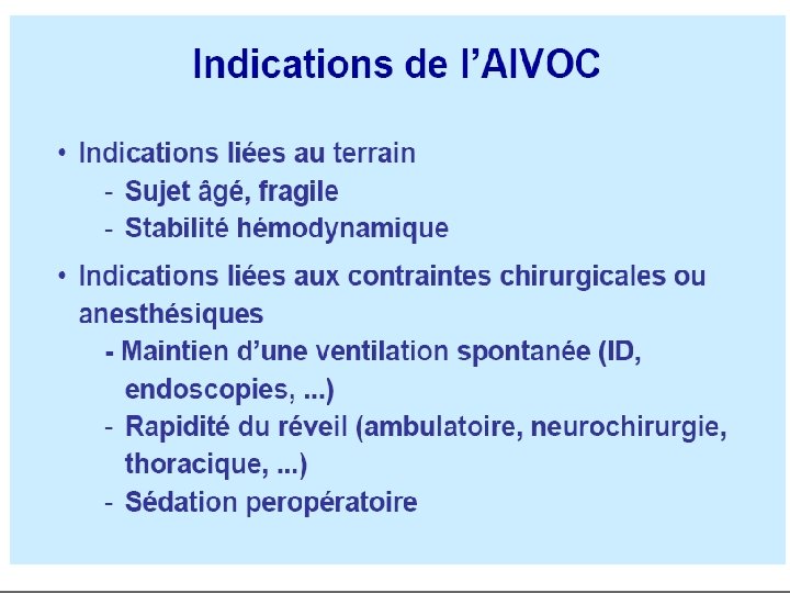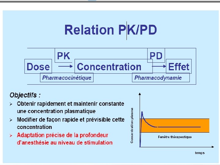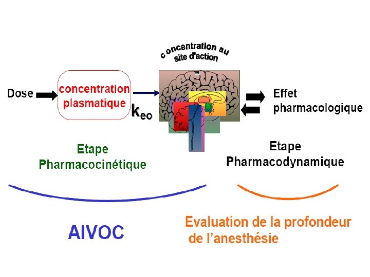 AIVOC ANESTHESIE INTRAVEINEUSE A OBJECTIF DE CONCENTRATION « Modalité simple d’administration des agents anesthésiques intraveineux basée sur l’obtention et le contrôle d’une concentration cible au niveau du plasma ou du site-effet, concentration choisie par le clinicien et en relation avec l’effet recherché » En Anglais TCI : TARGET CONTROLLED INFUSION L’AIVOC permet une titration précise et une simplification de l’administration des agents anesthésiques