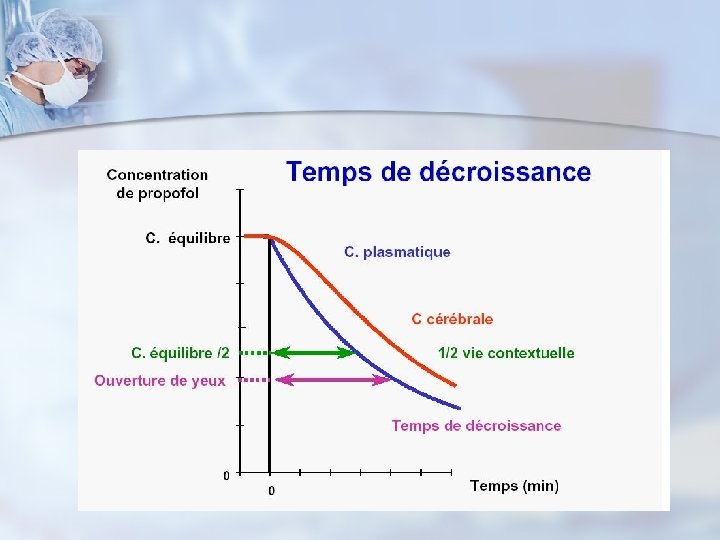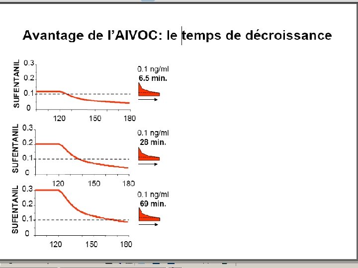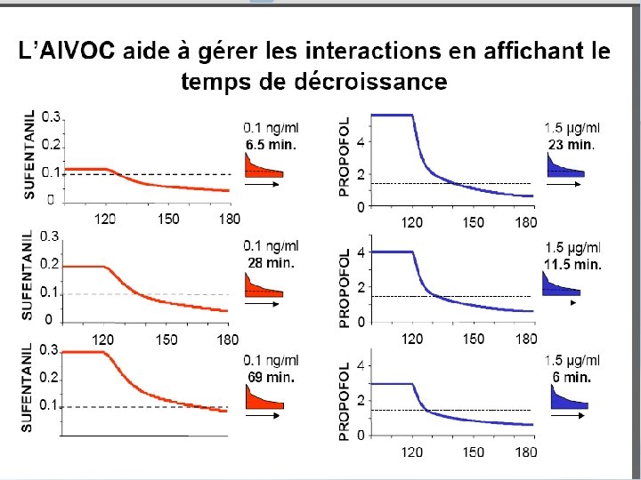 TEMPS DE DECROISSANCE n Le temps de décroissance est le temps mis à l’arrêt de la perfusion pour atteindre une concentration choisie qui est celle pour laquelle le réveil ou la reprise de ventilation spontanée est attendue n Le logiciel calcul en temps réel ce temps de décroissance en laissant la possibilité à l’utilisateur de choisir la valeur cible pour chaque patient