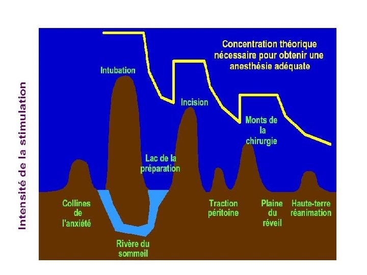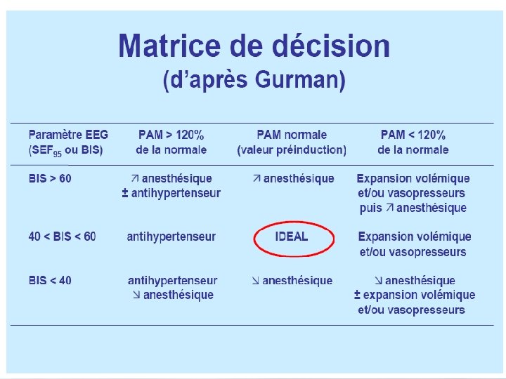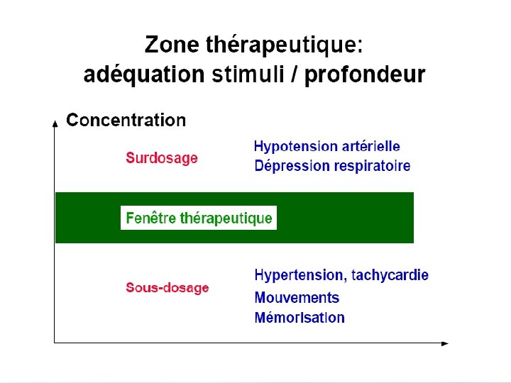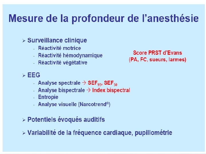 Le monitorage de la profondeur d’anesthésie Malgré son coût, le monitorage de la profondeur d’anesthésie s’impose progressivement dans les blocs opératoires Validation des concentrations-cibles choisies par le clinicien Lutte contre la mémorisation per opératoire (? ) Meilleure titration des agents hypnotiques +++ en particulier chez les personnes âgées