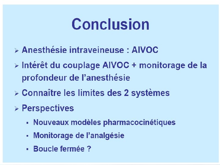 Astuces et gags n Harmoniser les pratiques n Disposition des seringues n Concentrations identiques n Voie exclusive pour les drogues d’anesthésie n Ne pas modifier la concentration aux changements de seringues n Sauvegarder les données en fin d’intervention