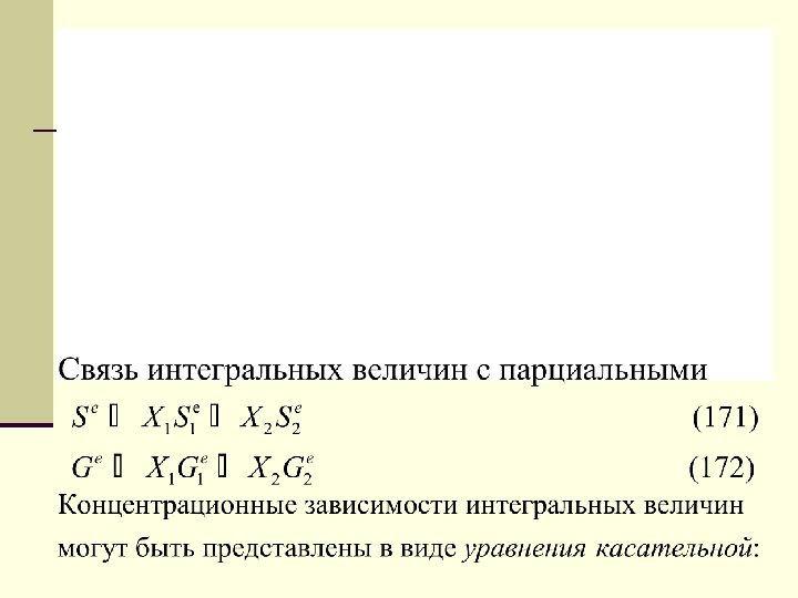 Для регулярных растворов характерна симметричная форма концентрационных зависимостей Ge и Ve. Избыточные парциальные молярные функции связаны между собой уравнениями Дюгема (см. также 120 - 127 и сравнить): X 1 d. V 1 e+X 2 d. V 2 e = 0 X 1 d. H 1 e+X 2 d. H 2 e = 0 (184) X 1 d. S 1 e+X 2 d. S 2 e = 0 (185) X 1 d. G 1 e+X 2 d. G 2 e = 0 или же : (183) (186)