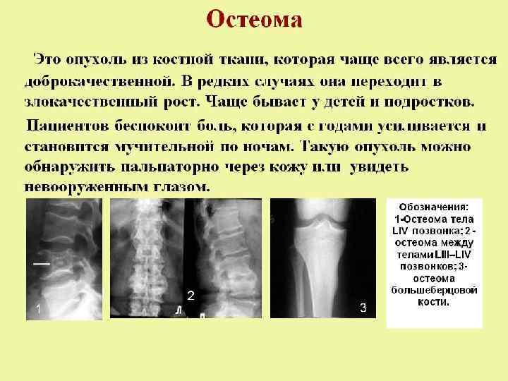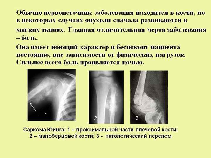Классические симптомы: • Классические симптомы: болевой синдром, пальпируемая опухоль, нарушение функциональности пораженных отделов скелета, неврологические симптомы при локализации опухоли возле крупных нервных стволов, костей черепа, позвоночника. • Боль – это самый ранний симптом опухолей костей, она не прекращаются и в покое, возможные ночные боли, иммобилизация не приносит облегчения. Нарушение функциональности и опухоль, которую можно прощупать – поздние симптомы болезни. При локализации опухоли в краевой доле трубчатых костей происходит развитие контрактуры суставов (затруднённость движений) и атрофии мышц. Если опухоль локализуется в средней доле, то функции суставов нарушаются в меньшей мере. На поздних стадиях опухоль может нарушить функции суставов. • Общие симптомы: интоксикация, лихорадка, снижение массы тела, возрастающая слабость, анемия.