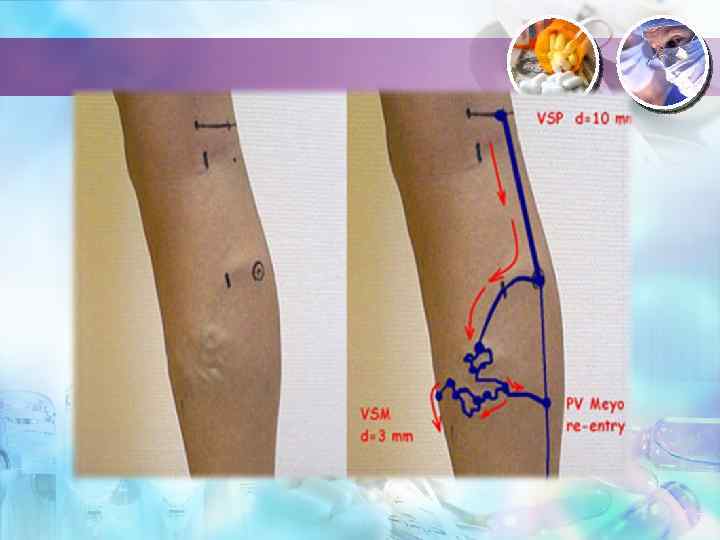 • Варикоз ауруы кезінде, 3 түрлі инъекциялық ем қолданылады: • 1. Сан венасына жалғасатын тері асты үлкен венаны, сан венасына жақындау, байлау және ретроградты тері асты үлкен венаға склероздайтын дәрі енгізу. • 2. Венаны байламай да, аталған венаға немесе сол тері асты үлкен венаға склероздайтын дәрі енгізу. • 3. Венаға кішкентай дозалармен склероздайтын дәріні бірнеше рет енгізу.