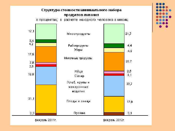 «О потребительской корзине в целом по Российской Федерации» ФЗ от 31. 03. 2006 № 44 –ФЗ 1. Продовольственные товары Наименование товаров Хлебные продукты (хлеб и макаронные изделия в пересчете на муку, мука, крупы, бобовые), кг Картофель, кг Овощи и бахчевые, кг Фрукты свежие, кг Сахар и кондитерские изделия в пересчете на сахар, кг Мясопродукты, кг Рыбопродукты, кг Молоко и молокопродукты в пересчете на молоко, кг Яйца, штука Масло растительное, маргарин и другие жиры, кг Прочие продукты (соль, чай, специи), кг Объём потребления (в среднем на одного человека в год) Трудоспособное Пенсионеры Дети население 133, 7 103, 7 84, 0 107, 6 97, 0 23, 0 22, 2 80, 0 92, 0 21, 2 107, 4 108, 7 51, 9 25, 2 37, 2 16, 0 238, 2 31, 5 15, 0 218, 9 33, 7 14, 0 325, 2 200, 0 13, 8 180, 0 11, 0 193, 0 10, 0 4, 9 4, 2 3, 6
