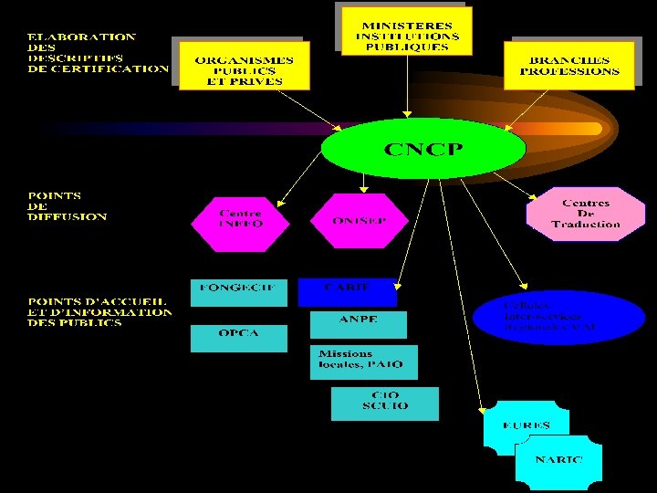 The CNCP composition • A prime minister attachment delegated to the minister of Labour • Composed with representatives of : – ministers which received a certification mission from the State – social partners – regions – chambers of industry and commerce – private vocational training centers
