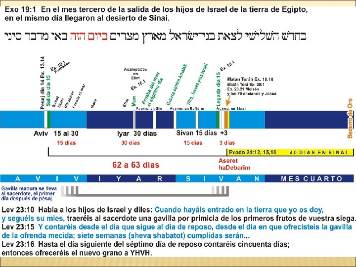 Según la tradición rabínica cuando el pueblo de Israel llega al monte Sinaí es el primer día del mes tercero (rosh jodesh), y mas los 3 días de purificación del pueblo sumarían 50 días desde la salida el día 15 de aviv.