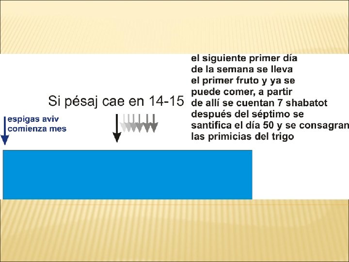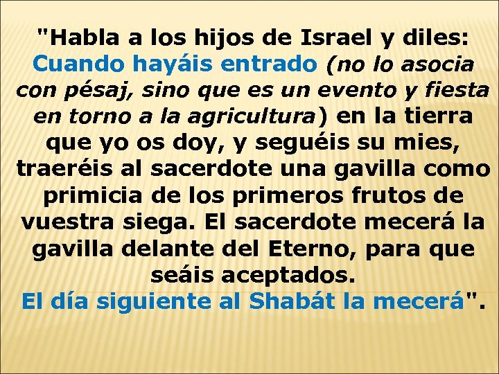 "Habla a los hijos de Israel y diles: Cuando hayáis entrado (no lo asocia con pésaj, sino que es un evento y fiesta en torno a la agricultura) en la tierra que yo os doy, y seguéis su mies, traeréis al sacerdote una gavilla como primicia de los primeros frutos de vuestra siega. El sacerdote mecerá la gavilla delante del Eterno, para que seáis aceptados. El día siguiente al Shabát la mecerá".