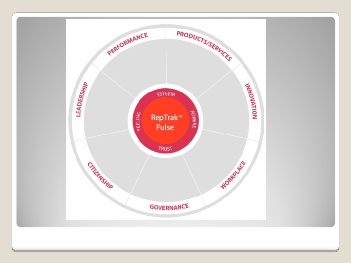Sette item della corporate reputation Indicatori associati Innovatività Innovazione Primi sul mercato Adattamento veloce ai cambiamenti Prodotti e servizi Qualità Convenienza (buon rapporto qualità-prezzo) Dietro le tendenze Soddisfa le esigenze dei clienti Performance Profittabilità Buone prospettive di crescita futura Alte performance nei confronti dei concorrenti Leadership Buona organizzazione Leader trascinante e motivante Eccellenza della leadership Chiara vision per il futuro Responsabilità sociale Impegno verso le cause sociali Responsabilità ambientale Influenza positiva con la società Eticità Aperto e trasparente Comportamento etico Equo per il modo in cui svolge la propria attività Ambiente di lavoro Premi ai dipendenti Benessere dei dipendenti Offre pari opportunità Rep Trak system