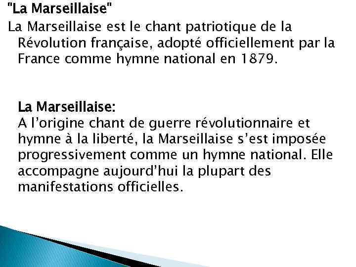 "La Marseillaise" La Marseillaise est le chant patriotique de la Révolution française, adopté officiellement par la France comme hymne national en 1879. La Marseillaise: A l’origine chant de guerre révolutionnaire et hymne à la liberté, la Marseillaise s’est imposée progressivement comme un hymne national. Elle accompagne aujourd’hui la plupart des manifestations officielles.
