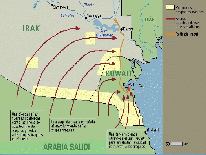 Ofensiva aliada El 16 de Enero de 1991 una coalición internacional de 31 países liderada por EE. UU inicia la maniobra militar. Países beligerantes: Arabia Saudí, España, EE. UU, Francia, Italia, Kuwait, Reino Unido entre otros.
