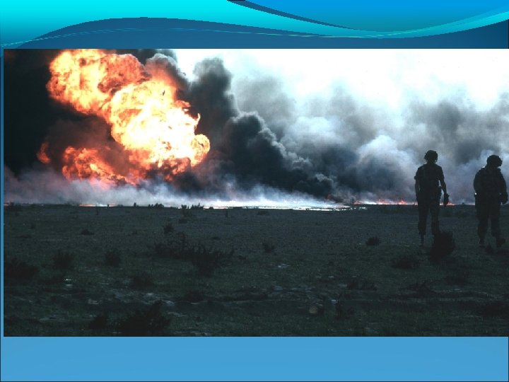 Operación Tormental del Desierto 1º Fase: paralización de la capacidad de respueta irakí Destrucción de radares irakís por aviones americanos F-11: uso de aviación. Irak comienza la Guerra del Medio Ambiente e Invierno Nuclear. Destrucción de las vías de comunicación de Kuwait. Desmoralización del enemigo. General Schzwarkopf: importancia artillería