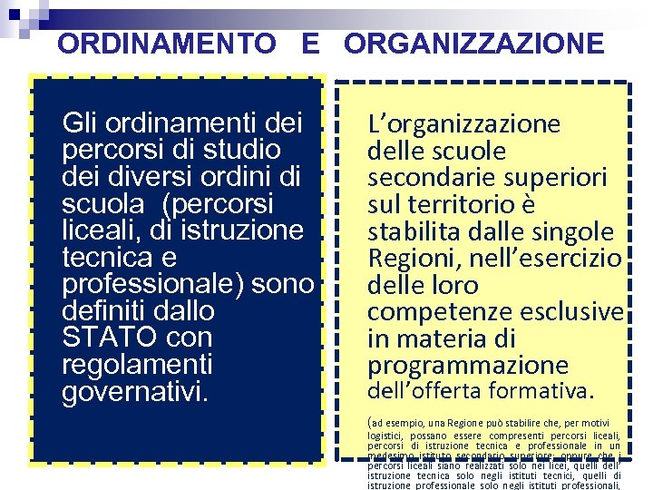 ORDINAMENTO E ORGANIZZAZIONE Gli ordinamenti dei percorsi di studio dei diversi ordini di scuola (percorsi liceali, di istruzione tecnica e professionale) sono definiti dallo STATO con regolamenti governativi. L’organizzazione delle scuole secondarie superiori sul territorio è stabilita dalle singole Regioni, nell’esercizio delle loro competenze esclusive in materia di programmazione dell’offerta formativa. (ad esempio, una Regione può stabilire che, per motivi logistici, possano essere compresenti percorsi liceali, percorsi di istruzione tecnica e professionale in un medesimo istituto secondario superiore; oppure che i percorsi liceali siano realizzati solo nei licei, quelli dell’ istruzione tecnica solo negli istituti tecnici, quelli di istruzione professionale solo negli istituti professionali,