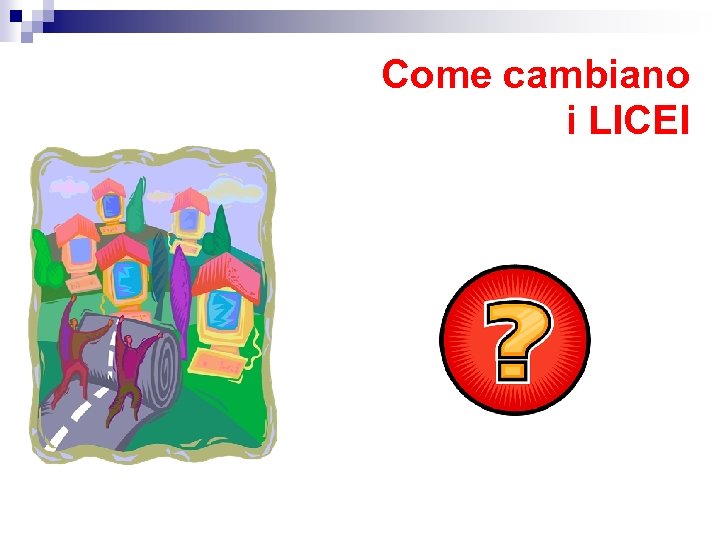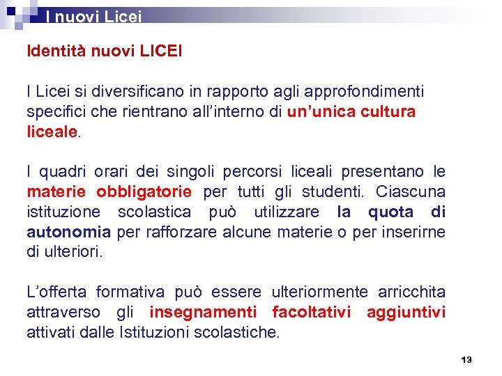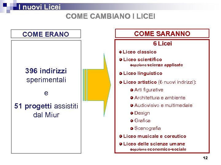 I nuovi Licei COME CAMBIANO I LICEI COME ERANO COME SARANNO 6 Licei Liceo classico Liceo scientifico 396 indirizzi sperimentali e 51 progetti assistiti dal Miur opzione scienze applicate Liceo linguistico Liceo artistico (6 nuovi indirizzi): Arti figurative Architettura e ambiente Audiovisivo e multimediale Design Grafica Scenografia Liceo musicale e coreutico Liceo delle scienze umane opzione economico-sociale 12