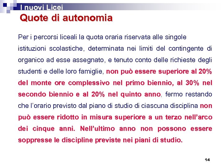 I nuovi Licei Quote di autonomia Per i percorsi liceali la quota oraria riservata alle singole istituzioni scolastiche, determinata nei limiti del contingente di organico ad esse assegnato, e tenuto conto delle richieste degli studenti e delle loro famiglie, non può essere superiore al 20% del monte ore complessivo nel primo biennio, al 30% nel secondo biennio e al 20% nel quinto anno, fermo restando anno che l’orario previsto dal piano di studio di ciascuna disciplina non può essere ridotto in misura superiore a un terzo nell’arco dei cinque anni. Nell’ultimo anno non possono essere soppresse le discipline previste nei piani di studio. 14