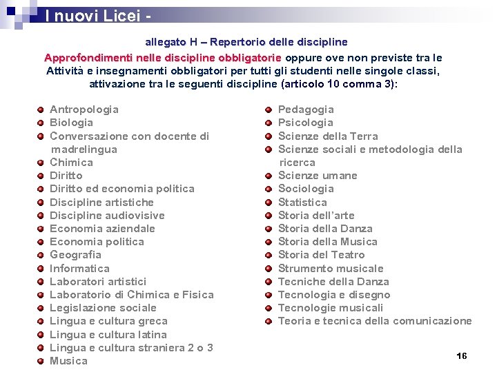 I nuovi Licei allegato H – Repertorio delle discipline Approfondimenti nelle discipline obbligatorie oppure ove non previste tra le Attività e insegnamenti obbligatori per tutti gli studenti nelle singole classi, attivazione tra le seguenti discipline (articolo 10 comma 3): Antropologia Biologia Conversazione con docente di madrelingua Chimica Diritto ed economia politica Discipline artistiche Discipline audiovisive Economia aziendale Economia politica Geografia Informatica Laboratori artistici Laboratorio di Chimica e Fisica Legislazione sociale Lingua e cultura greca Lingua e cultura latina Lingua e cultura straniera 2 o 3 Musica Pedagogia Psicologia Scienze della Terra Scienze sociali e metodologia della ricerca Scienze umane Sociologia Statistica Storia dell’arte Storia della Danza Storia della Musica Storia del Teatro Strumento musicale Tecniche della Danza Tecnologia e disegno Tecnologie musicali Teoria e tecnica della comunicazione 16