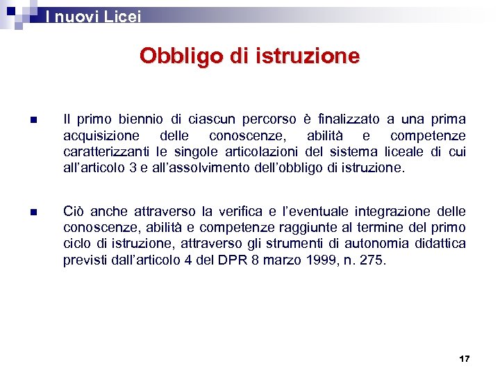 I nuovi Licei Obbligo di istruzione Il primo biennio di ciascun percorso è finalizzato a una prima acquisizione delle conoscenze, abilità e competenze caratterizzanti le singole articolazioni del sistema liceale di cui all’articolo 3 e all’assolvimento dell’obbligo di istruzione. Ciò anche attraverso la verifica e l’eventuale integrazione delle conoscenze, abilità e competenze raggiunte al termine del primo ciclo di istruzione, attraverso gli strumenti di autonomia didattica previsti dall’articolo 4 del DPR 8 marzo 1999, n. 275. 17