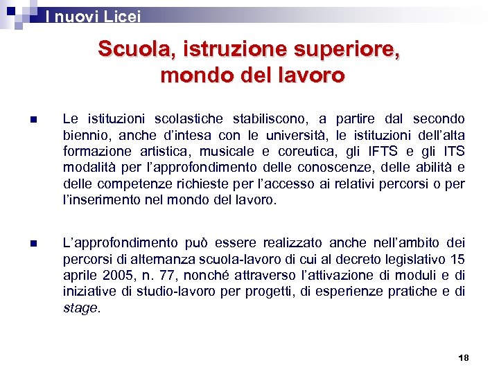 I nuovi Licei Scuola, istruzione superiore, mondo del lavoro Le istituzioni scolastiche stabiliscono, a partire dal secondo biennio, anche d’intesa con le università, le istituzioni dell’alta formazione artistica, musicale e coreutica, gli IFTS e gli ITS modalità per l’approfondimento delle conoscenze, delle abilità e delle competenze richieste per l’accesso ai relativi percorsi o per l’inserimento nel mondo del lavoro. L’approfondimento può essere realizzato anche nell’ambito dei percorsi di alternanza scuola-lavoro di cui al decreto legislativo 15 aprile 2005, n. 77, nonché attraverso l’attivazione di moduli e di iniziative di studio-lavoro per progetti, di esperienze pratiche e di stage. 18