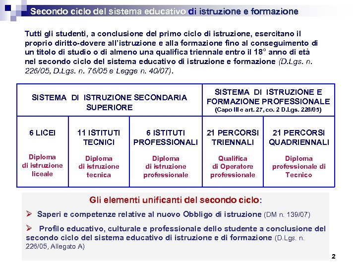 Secondo ciclo del sistema educativo di istruzione e formazione Tutti gli studenti, a conclusione del primo ciclo di istruzione, esercitano il proprio diritto-dovere all’istruzione e alla formazione fino al conseguimento di un titolo di studio o di almeno una qualifica triennale entro il 18° anno di età nel secondo ciclo del sistema educativo di istruzione e formazione (D. Lgs. n. 226/05, D. Lgs. n. 76/05 e Legge n. 40/07). SISTEMA DI ISTRUZIONE SECONDARIA SUPERIORE SISTEMA DI ISTRUZIONE E FORMAZIONE PROFESSIONALE (Capo III e art. 27, co. 2 D. Lgs. 226/05) 6 LICEI 11 ISTITUTI TECNICI 6 ISTITUTI PROFESSIONALI 21 PERCORSI TRIENNALI 21 PERCORSI QUADRIENNALI Diploma di istruzione liceale Diploma di istruzione tecnica Diploma di istruzione professionale Qualifica di Operatore professionale Diploma professionale di Tecnico Gli elementi unificanti del secondo ciclo: Ø Saperi e competenze relative al nuovo Obbligo di istruzione (DM n. 139/07) Ø Profilo educativo, culturale e professionale dello studente a conclusione del secondo ciclo del sistema educativo di istruzione e di formazione (D. Lgs. n. 226/05, Allegato A) 2