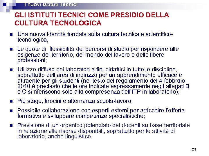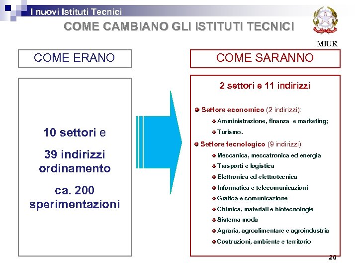 I nuovi Istituti Tecnici COME CAMBIANO GLI ISTITUTI TECNICI MIUR COME ERANO COME SARANNO 2 settori e 11 indirizzi Settore economico (2 indirizzi): Amministrazione, finanza e marketing; 10 settori e 39 indirizzi ordinamento ca. 200 sperimentazioni Turismo. Settore tecnologico (9 indirizzi): Meccanica, meccatronica ed energia Trasporti e logistica Elettronica ed elettrotecnica Informatica e telecomunicazioni Grafica e comunicazione Chimica, materiali e biotecnologie Sistema moda Agraria, agroalimentare e agroindustria Costruzioni, ambiente e territorio 20
