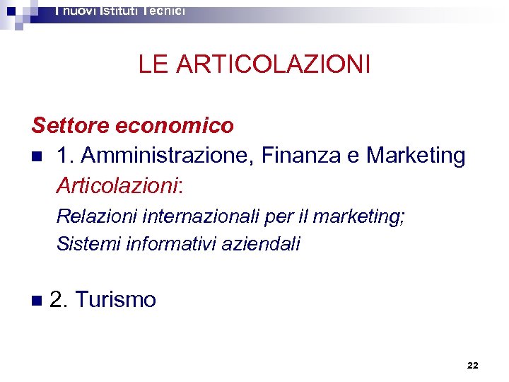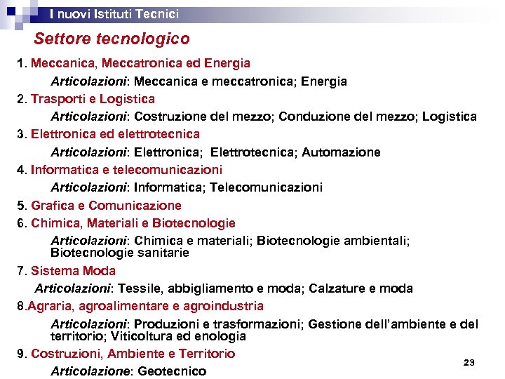 I nuovi Istituti Tecnici LE ARTICOLAZIONI Settore economico 1. Amministrazione, Finanza e Marketing Articolazioni: Relazioni internazionali per il marketing; Sistemi informativi aziendali 2. Turismo 22