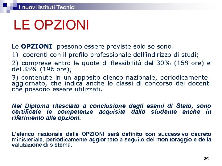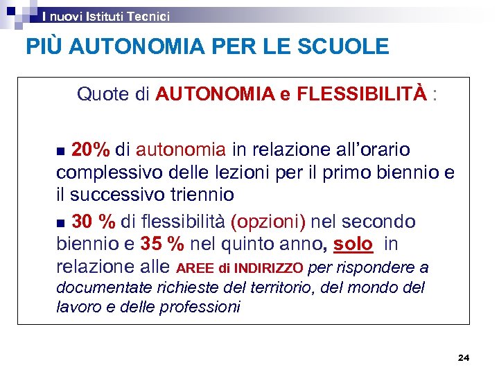 I nuovi Istituti Tecnici PIÙ AUTONOMIA PER LE SCUOLE Quote di AUTONOMIA e FLESSIBILITÀ : 20% di autonomia in relazione all’orario complessivo delle lezioni per il primo biennio e il successivo triennio 30 % di flessibilità (opzioni) nel secondo biennio e 35 % nel quinto anno, solo in relazione alle AREE di INDIRIZZO per rispondere a documentate richieste del territorio, del mondo del lavoro e delle professioni 24