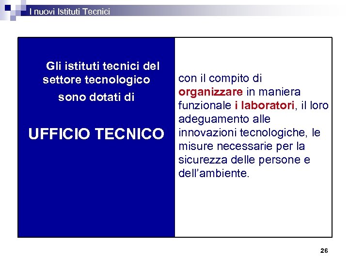 I nuovi Istituti Tecnici Gli istituti tecnici del settore tecnologico sono dotati di UFFICIO TECNICO con il compito di organizzare in maniera funzionale i laboratori, il loro adeguamento alle innovazioni tecnologiche, le misure necessarie per la sicurezza delle persone e dell’ambiente. 26