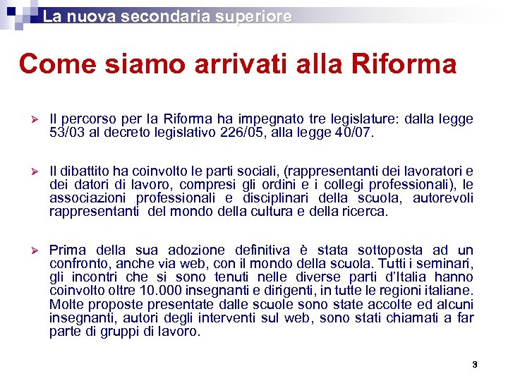 La nuova secondaria superiore Come siamo arrivati alla Riforma Ø Il percorso per la Riforma ha impegnato tre legislature: dalla legge 53/03 al decreto legislativo 226/05, alla legge 40/07. Ø Il dibattito ha coinvolto le parti sociali, (rappresentanti dei lavoratori e dei datori di lavoro, compresi gli ordini e i collegi professionali), le associazioni professionali e disciplinari della scuola, autorevoli rappresentanti del mondo della cultura e della ricerca. Ø Prima della sua adozione definitiva è stata sottoposta ad un confronto, anche via web, con il mondo della scuola. Tutti i seminari, gli incontri che si sono tenuti nelle diverse parti d’Italia hanno coinvolto oltre 10. 000 insegnanti e dirigenti, in tutte le regioni italiane. Molte proposte presentate dalle scuole sono state accolte ed alcuni insegnanti, autori degli interventi sul web, sono stati chiamati a far parte di gruppi di lavoro. 3