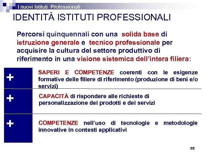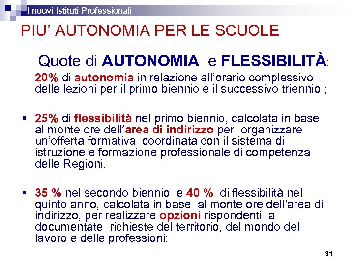 I nuovi Istituti Professionali IDENTITÀ ISTITUTI PROFESSIONALI Percorsi quinquennali con una solida base di istruzione generale e tecnico professionale per acquisire la cultura del settore produttivo di riferimento in una visione sistemica dell’intera filiera: + SAPERI E COMPETENZE coerenti con le esigenze formative delle filiere di riferimento (produzione di beni e/o servizi) + CAPACITÀ di rispondere alle richieste di personalizzazione dei prodotti e dei servizi + COMPETENZE nell’uso di tecnologie e metodologie innovative in contesti applicativi 30