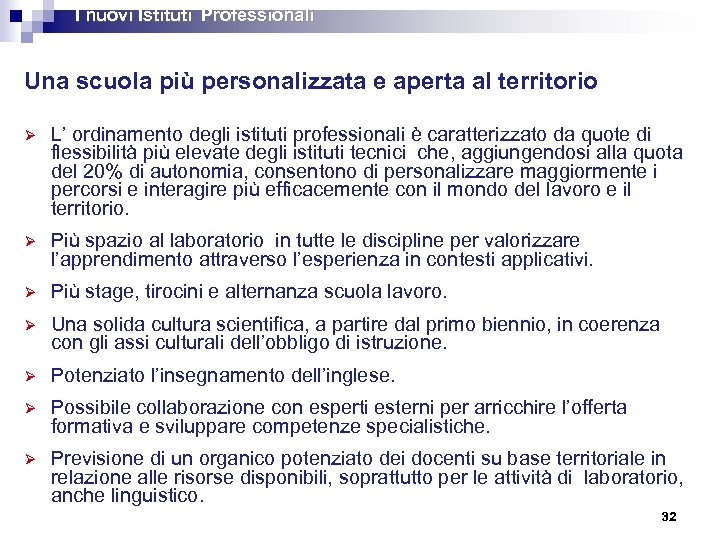 I nuovi Istituti Professionali PIU’ AUTONOMIA PER LE SCUOLE Quote di AUTONOMIA e FLESSIBILITÀ: 20% di autonomia in relazione all’orario complessivo delle lezioni per il primo biennio e il successivo triennio ; § 25% di flessibilità nel primo biennio, calcolata in base al monte ore dell’area di indirizzo per organizzare un’offerta formativa coordinata con il sistema di istruzione e formazione professionale di competenza delle Regioni. § 35 % nel secondo biennio e 40 % di flessibilità nel quinto anno, calcolata in base al monte ore dell’area di indirizzo, per realizzare opzioni rispondenti a documentate richieste del territorio, del mondo del lavoro e delle professioni; 31