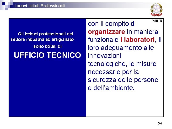 I nuovi Istituti Professionali MIUR Gli istituti professionali del settore industria ed artigianato sono dotati di UFFICIO TECNICO con il compito di organizzare in maniera funzionale i laboratori, il loro adeguamento alle innovazioni tecnologiche, le misure necessarie per la sicurezza delle persone e dell’ambiente. 34