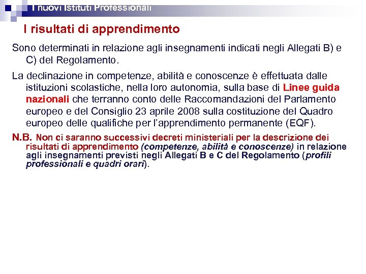 I nuovi Istituti Professionali I risultati di apprendimento Sono determinati in relazione agli insegnamenti indicati negli Allegati B) e C) del Regolamento. La declinazione in competenze, abilità e conoscenze è effettuata dalle istituzioni scolastiche, nella loro autonomia, sulla base di Linee guida nazionali che terranno conto delle Raccomandazioni del Parlamento europeo e del Consiglio 23 aprile 2008 sulla costituzione del Quadro europeo delle qualifiche per l’apprendimento permanente (EQF). N. B. Non ci saranno successivi decreti ministeriali per la descrizione dei risultati di apprendimento (competenze, abilità e conoscenze) in relazione agli insegnamenti previsti negli Allegati B e C del Regolamento (profili professionali e quadri orari).