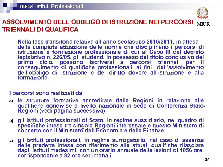 I nuovi Istituti Professionali ASSOLVIMENTO DELL’OBBLIGO DI ISTRUZIONE NEI PERCORSI TRIENNALI DI QUALIFICA MIUR Nella fase transitoria relativa all’anno scolastico 2010/2011, in attesa della compiuta attuazione delle norme che disciplinano i percorsi di istruzione e formazione professionale di cui al Capo III del decreto legislativo n. 226/05, gli studenti, in possesso del titolo conclusivo del primo ciclo, possono iscriversi a percorsi triennali per il conseguimento di qualifiche professionali, ai fini dell’assolvimento dell’obbligo di istruzione e del diritto dovere all’istruzione e alla formazione. I percorsi sono realizzati da: a) le strutture formative accreditate dalle Regioni in relazione alle qualifiche condivise a livello nazionale in sede di Conferenza Stato. Regioni (vedi pagina successiva); b) gli istituti professionali di Stato, in regime sussidiario, nel quadro di specifiche intese tra singole Regioni interessate e questo Ministero di concerto con il Ministero dell’Economia e delle Finanze; c) gli istituti professionali, in regime surrogatorio, nel caso di assenza delle predette intese con riferimento alle attuali qualifiche rilasciate dagli istituti medesimi, con un orario annuale delle lezioni di 1056 ore, corrispondente a 32 ore settimanali. 38