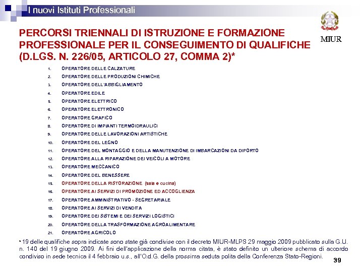 I nuovi Istituti Professionali PERCORSI TRIENNALI DI ISTRUZIONE E FORMAZIONE PROFESSIONALE PER IL CONSEGUIMENTO DI QUALIFICHE (D. LGS. N. 226/05, ARTICOLO 27, COMMA 2)* 1. OPERATORE DELLE PRODUZIONI CHIMICHE 3. OPERATORE DELL’ABBIGLIAMENTO 4. OPERATORE EDILE 5. OPERATORE ELETTRICO 6. OPERATORE ELETTRONICO 7. OPERATORE GRAFICO 8. OPERATORE DI IMPIANTI TERMOIDRAULICI 9. OPERATORE DELLE LAVORAZIONI ARTISTICHE 10. OPERATORE DEL LEGNO 11. OPERATORE DEL MONTAGGIO E DELLA MANUTENZIONE DI IMBARCAZIONI DA DIPORTO 12. OPERATORE ALLA RIPARAZIONE DEI VEICOLI A MOTORE 13. OPERATORE MECCANICO 14. OPERATORE DEL BENESSERE 15. OPERATORE DELLA RISTORAZIONE (sala e cucina) 16. OPERATORE AI SERVIZI DI PROMOZIONE ED ACCOGLIENZA 17. OPERATORE AMMINISTRATIVO - SEGRETARIALE 18. OPERATORE AI SERVIZI DI VENDITA 19. OPERATORE DEI SISTEMI E DEI SERVIZI LOGISTICI 20. OPERATORE DELLA TRASFORMAZIONE AGROALIMENTARE 21. * 19 OPERATORE DELLE CALZATURE 2. MIUR OPERATORE AGRICOLO delle qualifiche sopra indicate sono state già condivise con il decreto MIUR-MLPS 29 maggio 2009 pubblicato sulla G. U. n. 140 del 19 giugno 2009. Ai fini dell’applicazione della norma citata, è stato definito un ulteriore schema di accordo condiviso in sede tecnica il 4 febbraio u. s. , all’O. d. G. della prossima seduta polita della Conferenza Stato-Regioni. 39