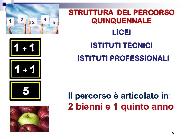 La nuova secondaria superiore Superare la frammentazione degli indirizzi …. Il ritardo di una riforma organica della scuola secondaria superiore ha sollecitato le scuole ed il Ministero ad utilizzare la via delle sperimentazioni per adattare i curricoli scolastici alle trasformazioni ed ai bisogni della società. Dagli anni ’ 90 ad oggi si sono accumulati centinaia e centinaia di indirizzi: 396 indirizzi sperimentali nei licei; 204 (tra corsi di ordinamento e sperimentazioni) nei tecnici; e 27 indirizzi e 5 settori nei professionali. Le sovrapposizioni e le duplicazioni tra i percorsi e gli indirizzi hanno condizionato la trasparenza e la chiarezza dell’offerta formativa. 4